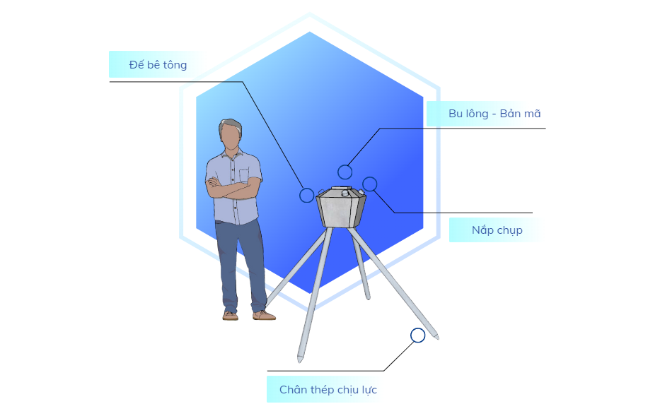 Hiển nhiên, 4 chân thép chịu lực được cố định bởi đế bê tông tạo nên một cấu trúc thống nhất như một bộ rễ vững chắc của những cây cổ thụ trăm năm.