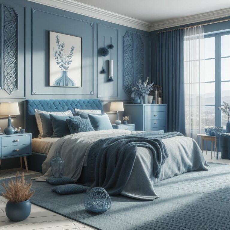 Chọn xanh lam cho đồ nội thất lớn như giường ngủ hoặc rèm cửa. Màu này đậm hơn một chút so với màu chủ đạo, giúp tạo sự tương phản nhẹ nhàng và làm nổi bật khu vực trung tâm của phòng ngủ.