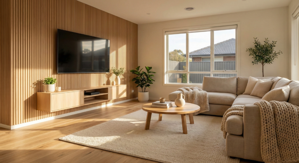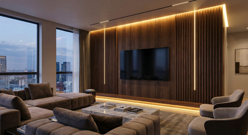Nội dung thực hiện: Ốp toàn bộ mảng tường Tivi bằng hệ Lam sóng nhựa nguyên sinh đơn sắc (thường là tông màu gỗ Sồi hoặc gỗ Tần bì).